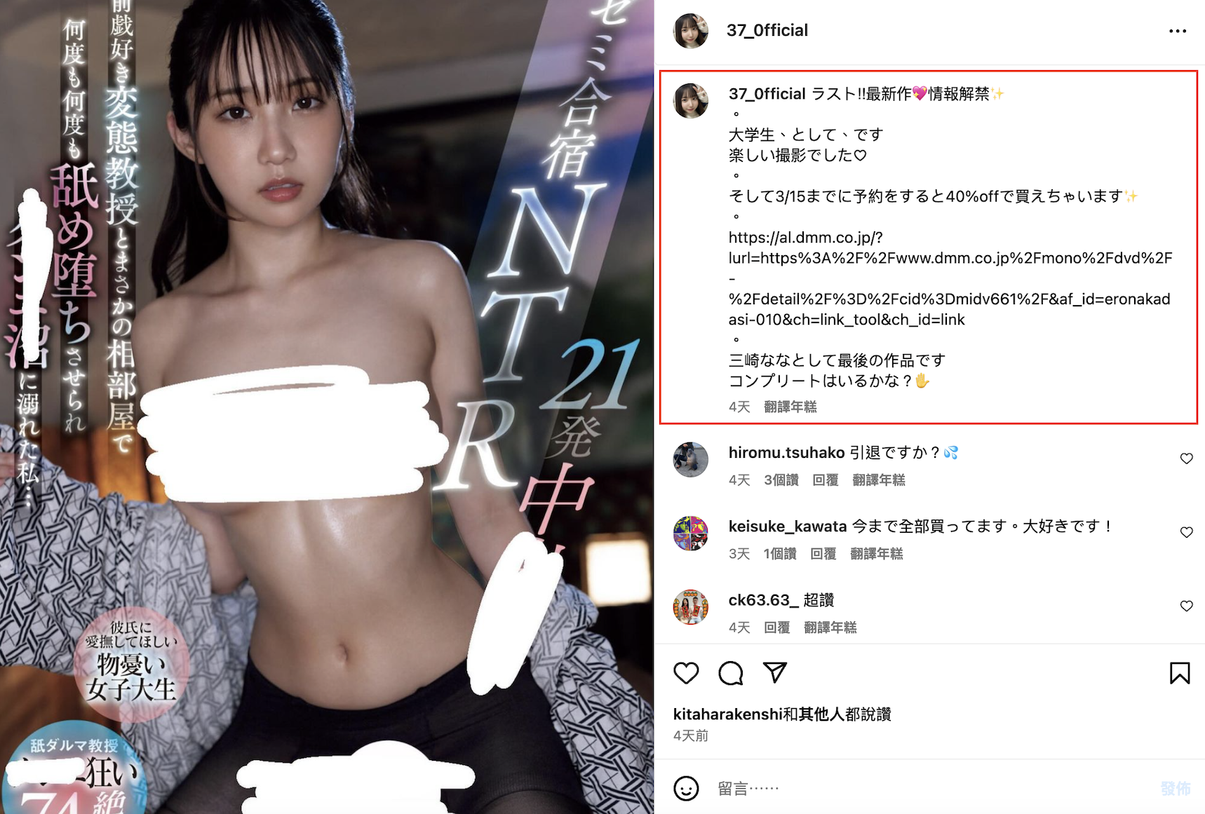这是她在IG上写的,不是担任专属女优的最后一支作品而是三崎なな(三崎奈奈)的最后一片ー虽然在Moodyz专属发了十支作品是蛮不错的,不过在大家都没讲的情况自己爆料是最后一片也真有趣,看来她不只在片中有小辣椒的感觉,在场外也是想什么就说什么啊⋯
