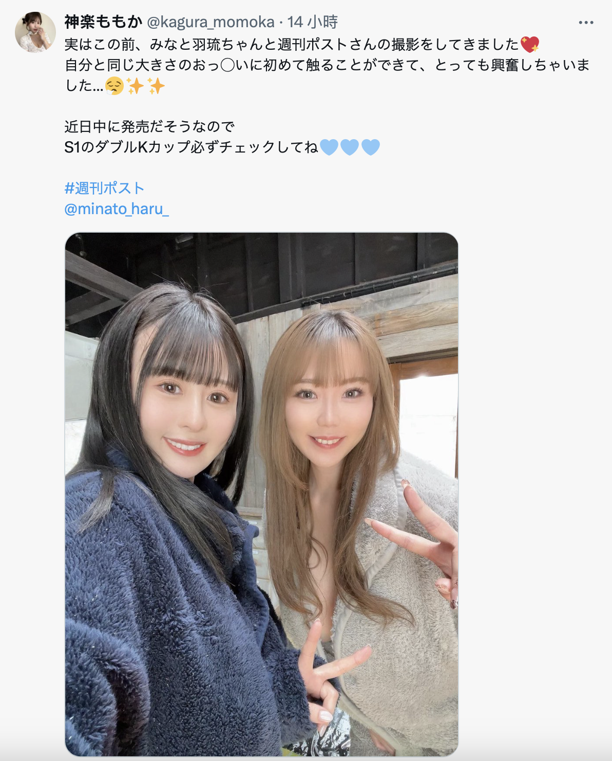 这就是重点了,みなと羽琉(凑羽琉)其实写得没很清楚,但神楽那边的发文(https://twitter.com/kagura_momoka)一开始就告诉大家,这是周刊ポスト(周刊Post )的摄影: