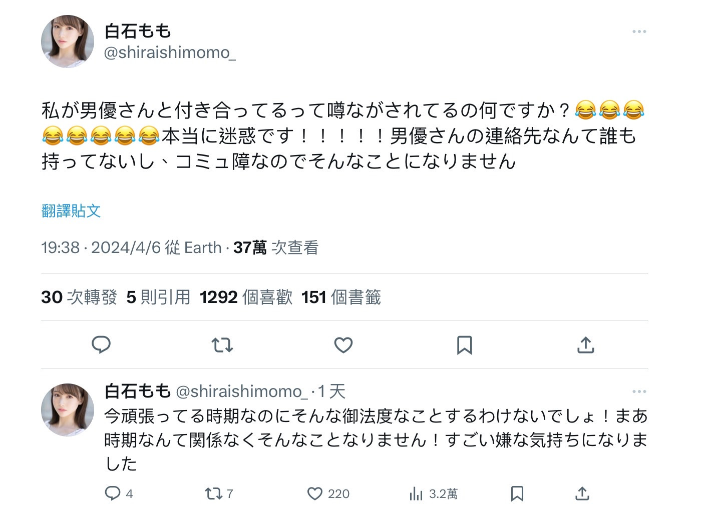 为什么她这么不开心?原来她在X(https://twitter.com/shiraishimomo_)自爆最近业界流传她的绯闻,很多人以为她和某个男优在谈恋爱⋯