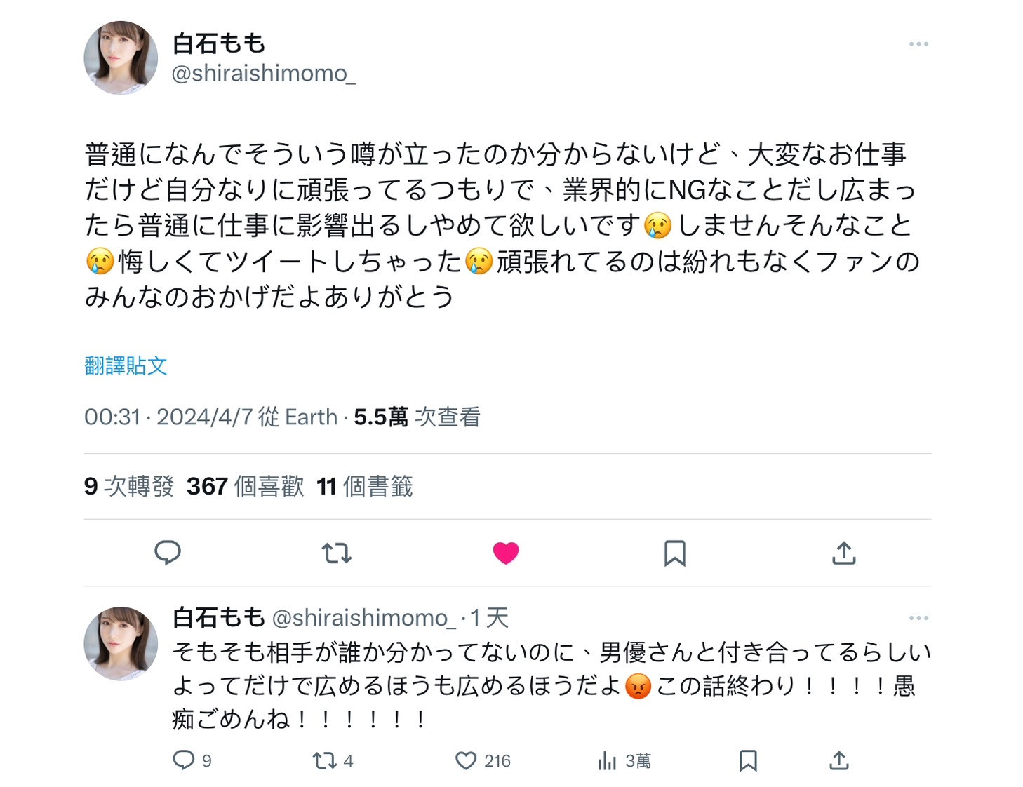 可能会有人觉得男女优谈恋爱也没什么不好,澄清就可以,白石もも(白石桃)干嘛反应这么大?
