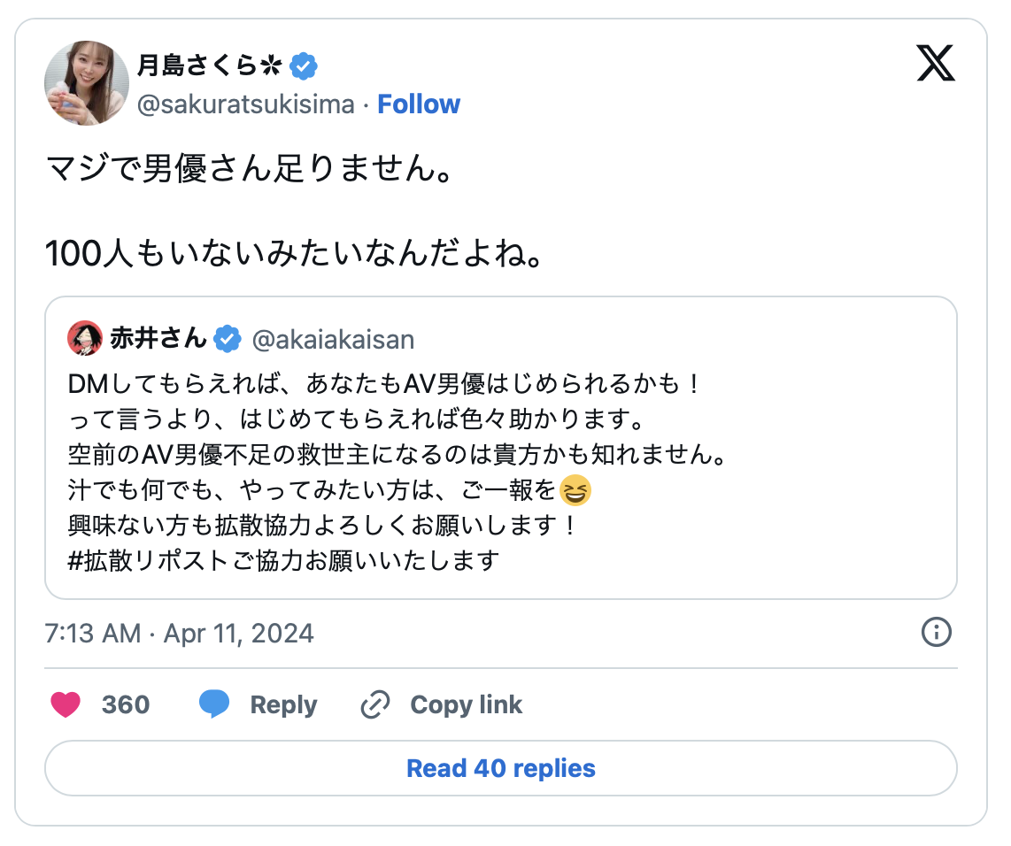 著名的AV男优漫画家、也是事务所アルヴィロッソ(Alvirosso)的代表「赤井さん」是在自己的X(https://twitter.com/akaiakaisan)揭露了这个状况,请注意喔,他是用「空前不足」来形容目前AV男优短缺的困境,然后他拜托有兴趣当AV男优的30公分们赶快私讯,「也许你就是AV界救世主」: