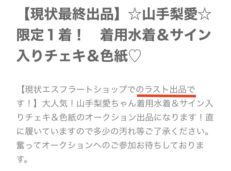 其实还是和拍卖有关,不久前这套泳装加上签名拍立得的套组就被事务所以「ラスト出品(最后一件)」名义上架,最后是以22,000円成交ー而这也意味着山手梨爱所有的任务结束了,她没有衣服卖了,所以这个X帐号也就没有存在的必要了: