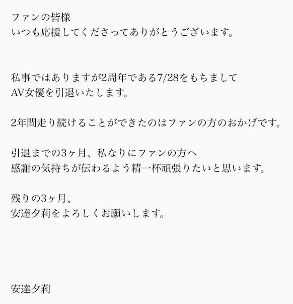这两天正在参加「近代麻雀水着祭」、也是片商S1专属女优的「安达夕莉」突然发表引退声明,她打算在出道两周年的7月28号引退,不做AV女优了~