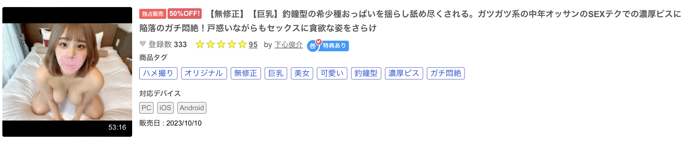 然后这支无码片贩售的时间是不久前的10月10号,也就是说在有码出道作上市没多久后无码片跟着贩售,现在这种现象不多,比较合理的解释是有码界为了遵守AV新法的规定所以必须先解释片子演出内容后签约然后等一个月拍片再等四个月左右才能把片子发出来,而很多女优连这半年左右的时间都撑不到就退社成为没有经纪公司的自身,接着就被无码卖家捕获了⋯